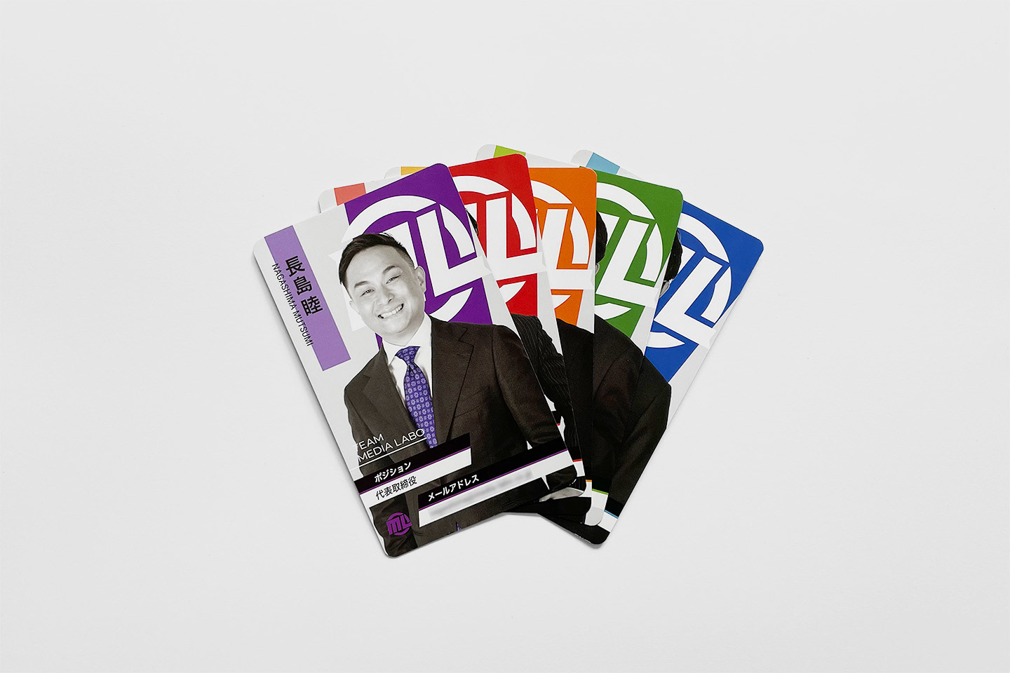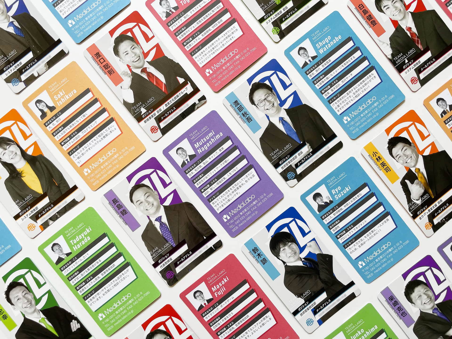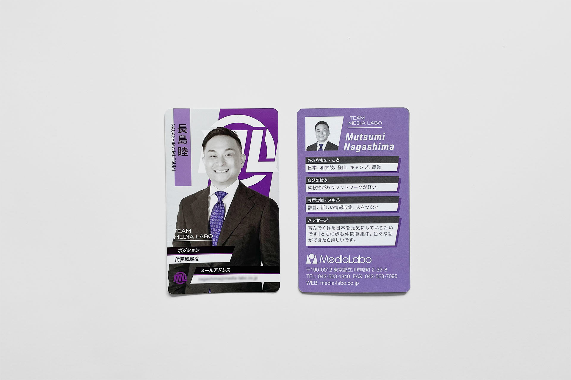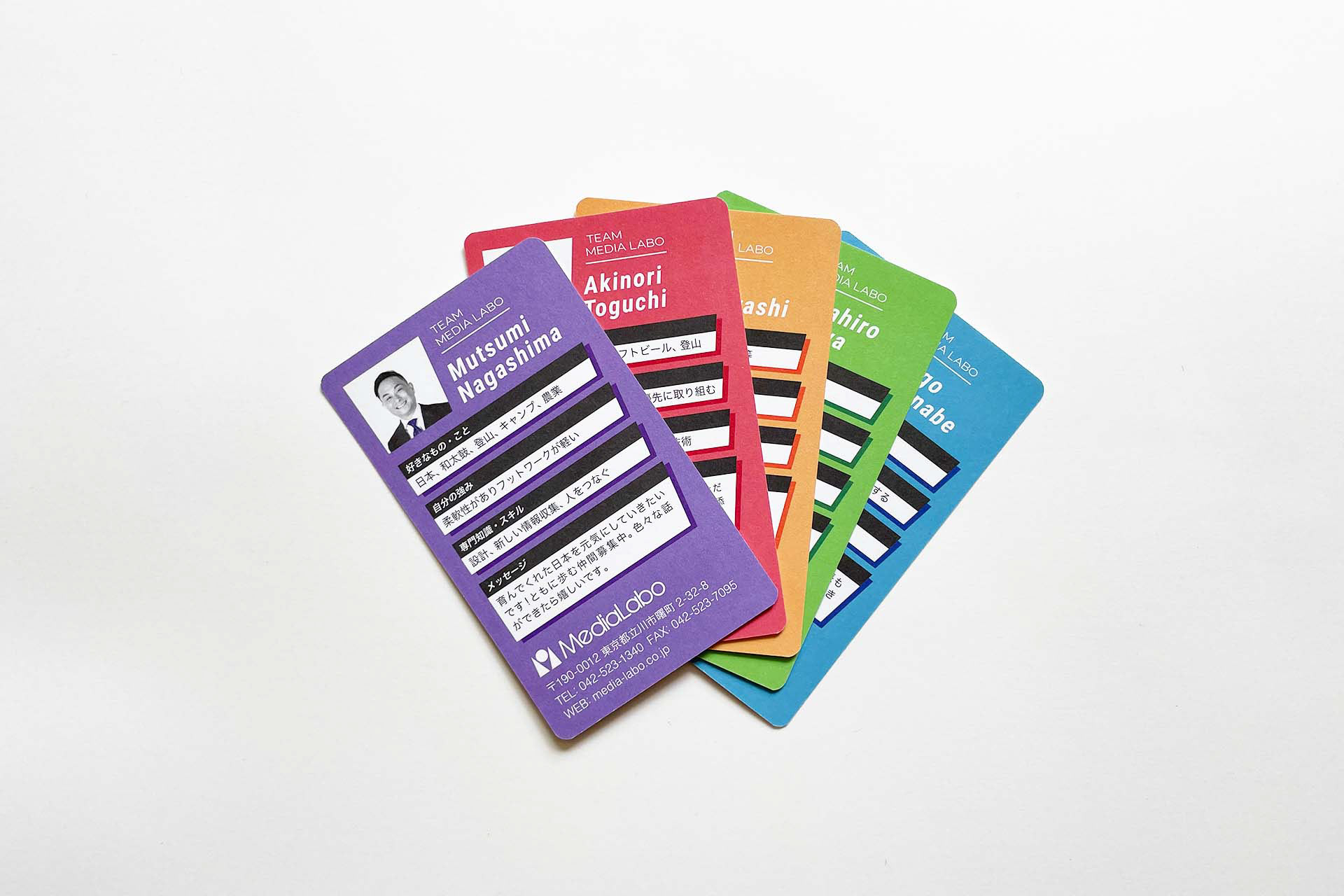 I designed business cards for Media Labo Inc. whose main business is designing, developing, and managing software for small and medium-sized businesses. I designed the card with the following two objectives in mind: 1) to strengthen employees' awareness that they are working not for themselves but for someone else and for society, and 2) to reduce lost opportunities and glitches caused by poor communication with customers. While maintaining a tone and manner appropriate for use on business, I aimed to create design which resemble an energetic and cool superhero collector's card, that would internalize the philosophy of Media Labo for each employee to “work for someone else and for society,” and also correct the owner's own attitude.